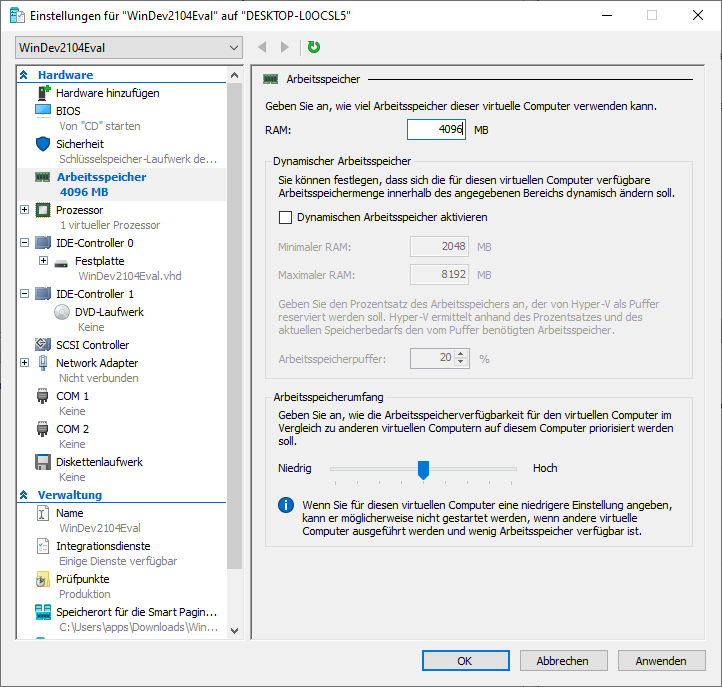 Zunächst erhöhe ich ein bisschen den Arbeitsspeicher. Mein Rechner verfügt über 16 GB RAM, so dass ich zumindest den Arbeitsspeicher auf 4 GB erhöhen kann.