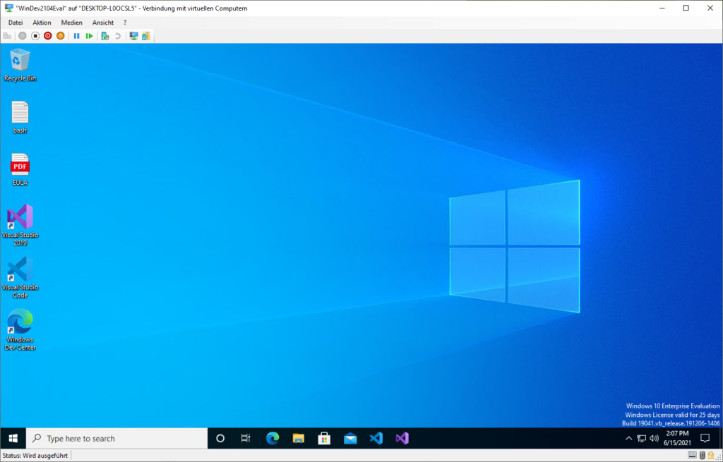 Euch steht jetzt ein vollständiges Windows 10 zur Verfügung, welches bereits Visual Studio und Visual Studio Code installiert hat. Somit kann man jetzt direkt mit der Entwicklung beginnen oder aber diese virtuelle Maschine nutzen, um zum Beispiel die neusten Frameworks einmal auszuprobieren.