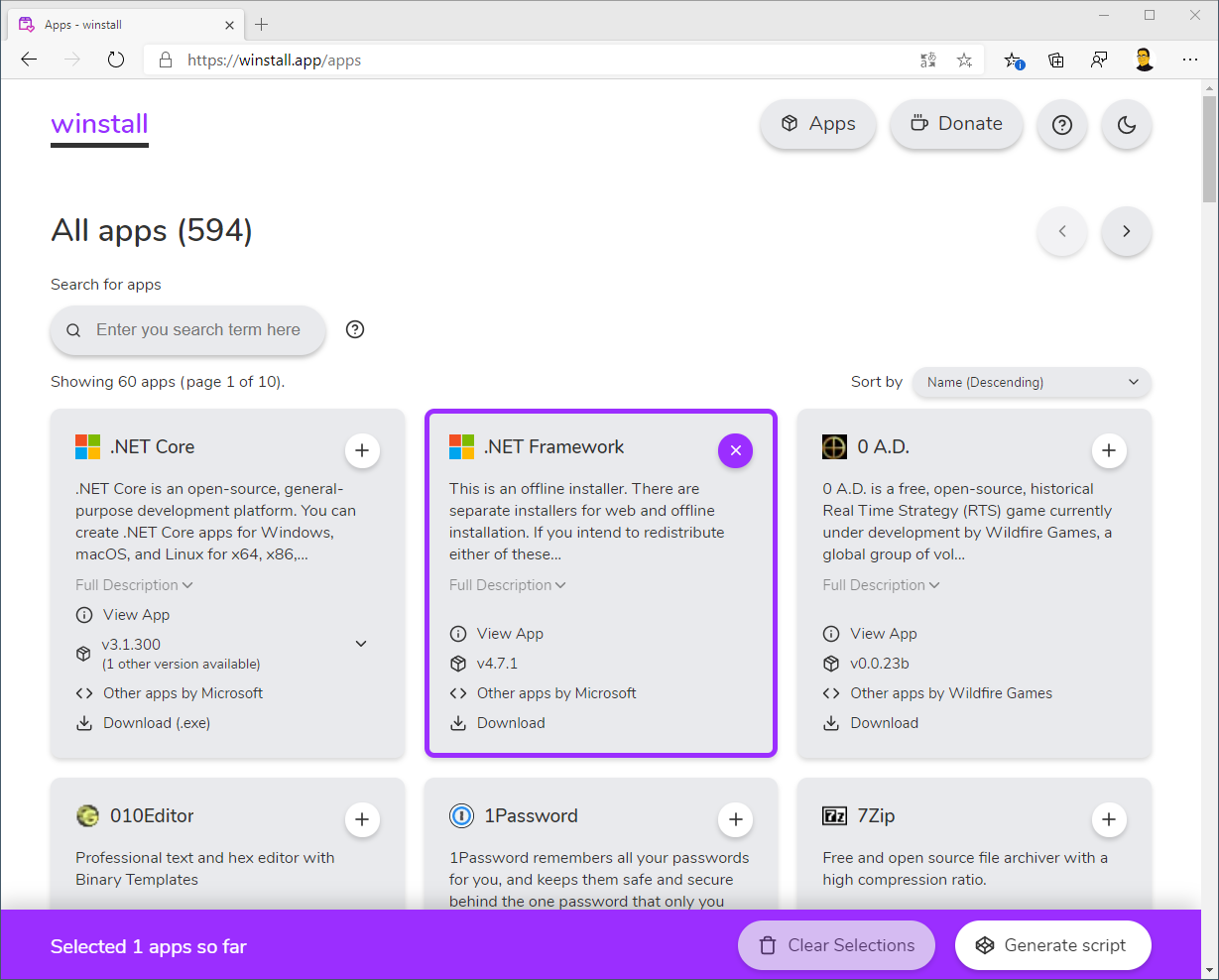 Auf der Startseite werden ein paar Apps/Programme gehighlightet, welche sich aber bei jedem Laden der Webseite ändern. Darüber hinaus gibt es eine Suchfunktion oder die Möglichkeit direkt alle Apps zu betrachten. Um nun ein eigenes Installations-Skript zu erstellen, würde ich empfehlen sich alle Programme anzeigen zu lassen. Durch das Klicken des kleinen Plus-Icons in der oberen Ecke kann man das Programm zu seinem „Warenkorb“ hinzufügen, was durch einen farbigen Rahmen dargestellt wird.