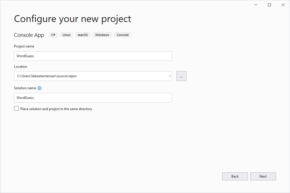 Anschließend vergeben wir unserem Projekt einen Namen, z.B. WordGuess.