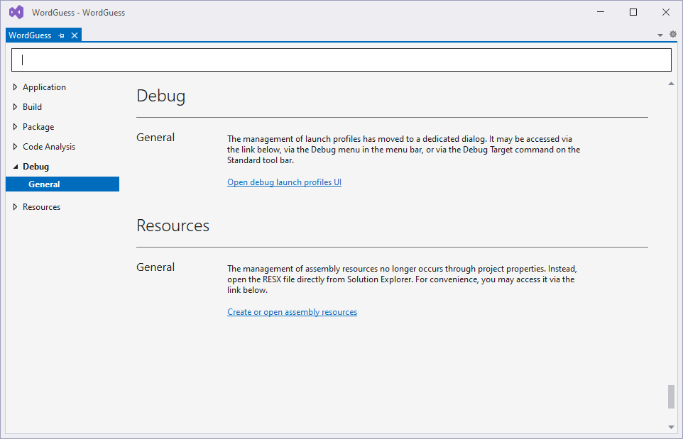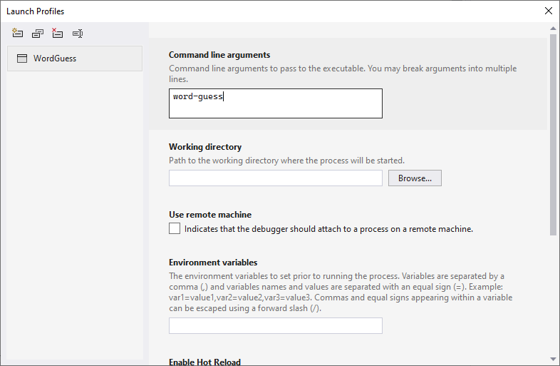 Hier klicken wir auf den Link Open debug launch profiles UI und tragen entsprechend word-guess ein, denn dies ist der Befehl für unser Spiel.