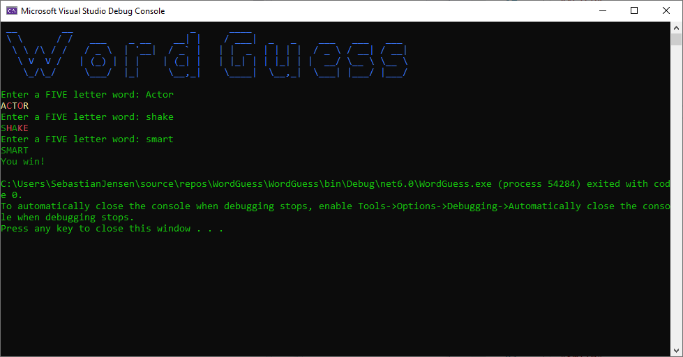 Zunächst lassen wir uns vom Nutzer ein Wort geben. Hier findet auch in der Methode GetWordFromUser bereits ein wenig Validierung statt, denn so schauen wir, dass das Wort fünf Zeichen lang ist. Anschließend überprüfen wir, dass das eingegeben Wort in unserer Wortliste enthalten ist, denn ansonsten könnte der Nutzer auch Worte wie AAAAAoder AEIOUausprobieren. Sollte dies nicht der Fall sein, so beginnt die Abfrage nach einem Wort von vorne. Sollte das Wort ein valides Wort sein, so überprüfen wir nun jeden Buchstaben einzeln, ob dieser entweder an der richtigen Stelle (Darstellung in grün), an der falschen Stelle (Darstellung in gelb) oder gar nicht im Wort enthalten ist (Darstellung in rot). Zu guter Letzt schauen wir noch, ob das eingegebene Wort dem gesuchten Wort entspricht, in diesem Fall können wir die While-Schleife beenden und dem Nutzer zum gewonnenen Spiel gratulieren. Ansonsten schauen wir, dass die Anzahl der Versuche noch passt und starten einen neuen Eingabeprozess durch den Nutzer. Ihr seht, dass die eigentliche Logik gar nicht mal so komplex ist.