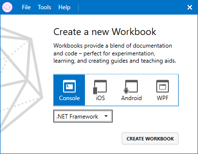 Hier hat man die Auswahl zwischen einer klassischen Konsolen-Anwendung oder aber auch iOS- bzw. Android-Apps mit Xamarin bzw. Xamarin.Forms. Für diesen Beitrag werde ich mich erst einmal auf die Konsolen-Anwendung beschränken und einfach mit einen Klick auf Create Workbook den Dialog bestätigen.