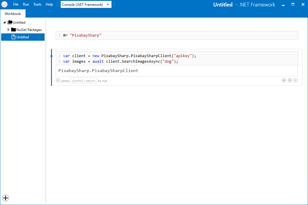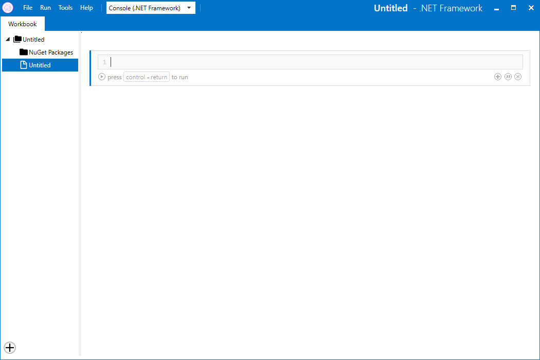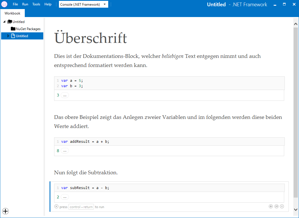 In einem Workbook gibt es zwei Arten von Blöcken. Zum einen den Dokumentations-Block, welcher beliebigen Text in Markdown-Syntax entgegen nimmt und entsprechend formatiert oder aber ein Code-Block, wo man C#-Code eingeben kann, welcher dann interpretiert wird.